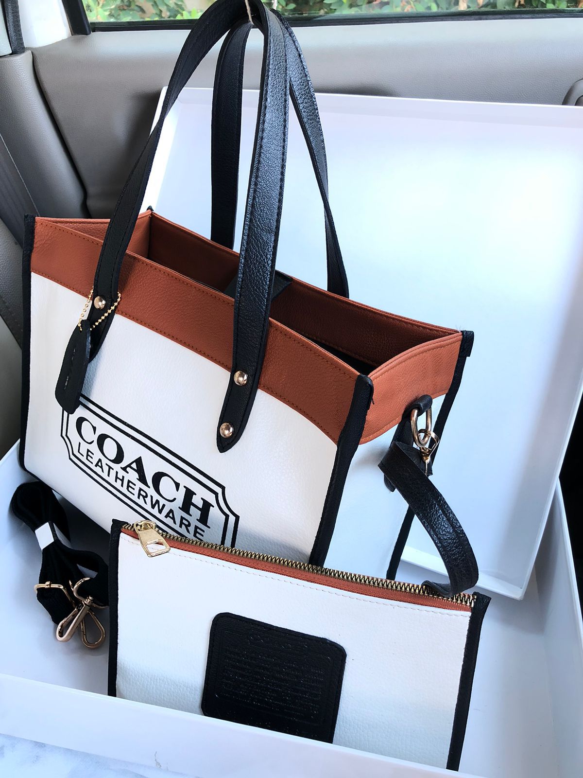 A sophisticated two-piece set combining a large tote with a detachable pouch for versatile use.