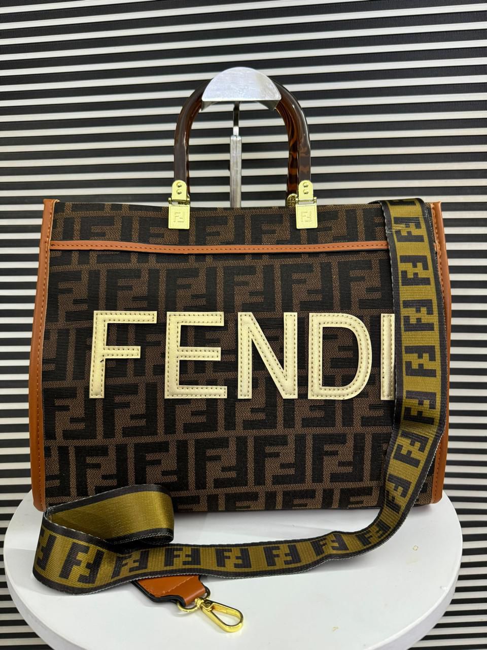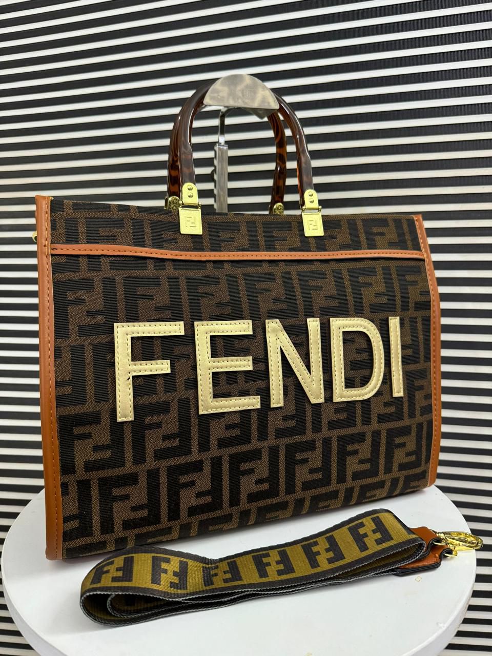 Features signature oversized “FENDI ROMA” embossed branding
